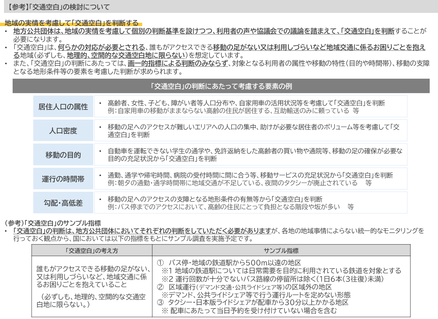 「交通空白」の解消に向け、まずは全国各地の「交通空白」の状況を把握する必要があり、各自治体においては、地域の実情を考慮して個別の判断基準を設けつつ、利用者の声や協議会での議論を踏まえて、「交通空白」を判断することが必要となります。