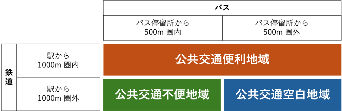 この記事では、分析の一例として、交通空白地に一定の定義を設定して解説をしますが、上記のとおり、実際には各自治体が地域の実情を考慮して「交通空白」を個別に判断する必要があるということを留意してください。