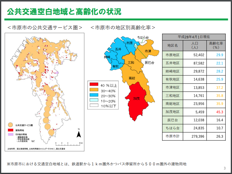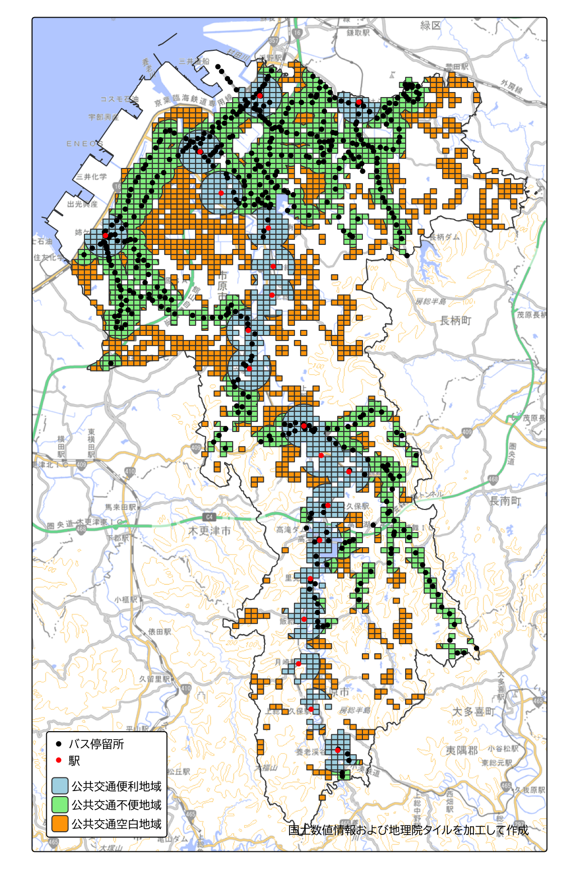 この記事では、例として、千葉県市原市を対象地域として分析をおこないます。 なお、千葉県市原市では、実際に交通空白地対策として、公共交通不便地域・公共交通空白地域の特定と、その解消に向けた施策が以前より取り組まれています(市原市における交通空白地域対策について〜地域住民との協働による取り組み〜(千葉県市原市 企画部交通政策課))。