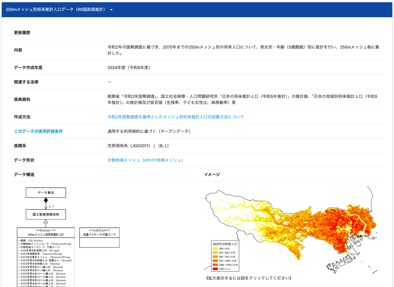 メッシュ別将来推計人口データは、日本全国の領域を一定サイズのメッシュに区切り、各メッシュごとの人口を推計したデータセットです。