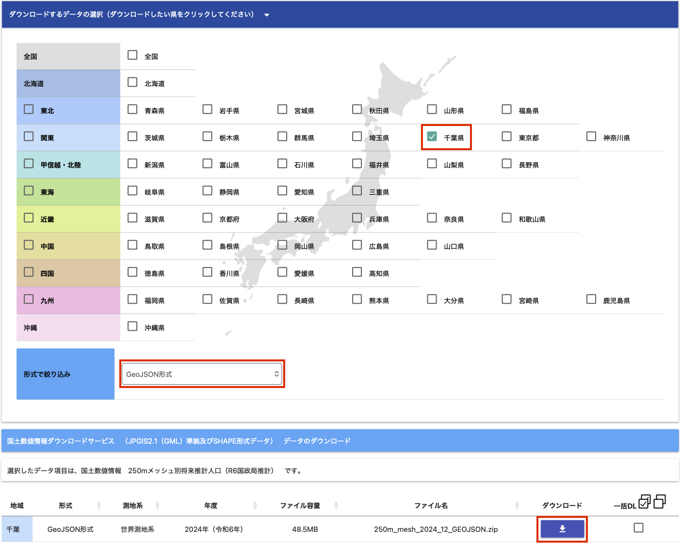 国土数値情報ダウンロードサイトの250 mメッシュ別将来推計人口データにアクセスします。