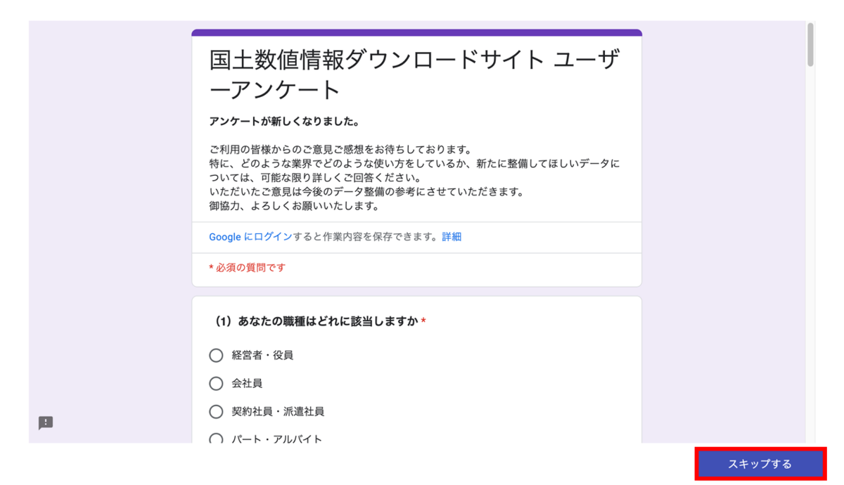 データのダウンロード時にアンケートが表示されたら、回答もしくは[スキップする]をクリックするとデータのダウンロードが開始されます。