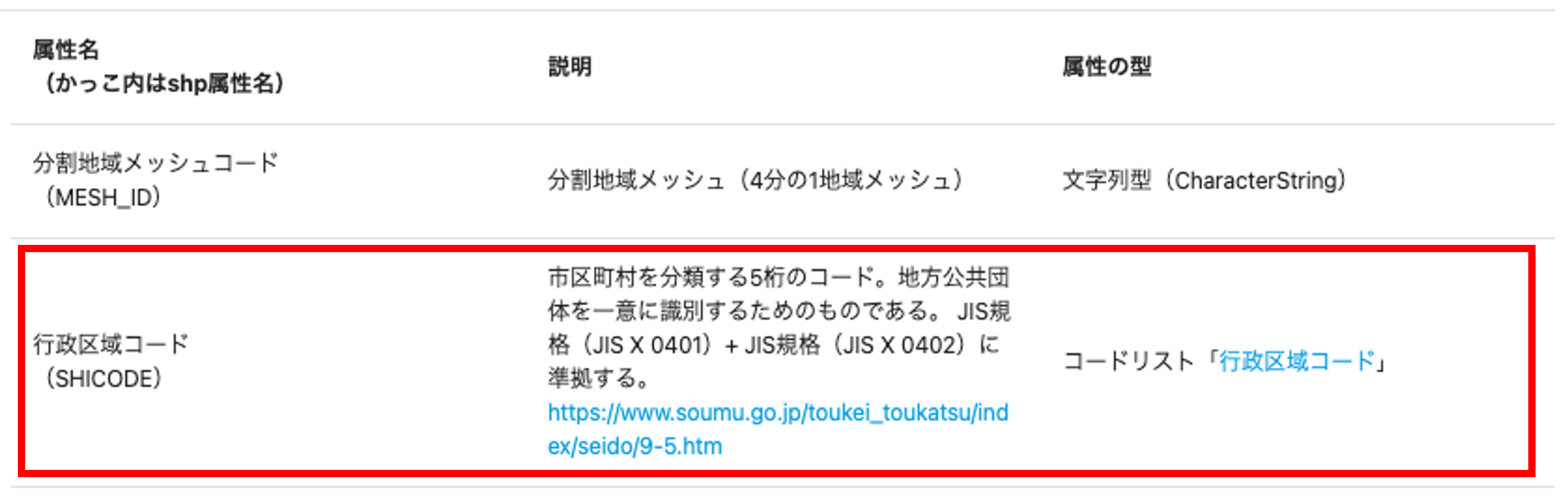 データのダウンロードページを確認すると、250 mメッシュ人口データは「SHICODE」という属性名で行政区域コードを属性情報として持っていることがわかります。 行政区域コードとは、市区町村を分類するための5桁のコードのことです。 データのダウンロードページからコードリストをダウンロードすることでコードを確認することができます。