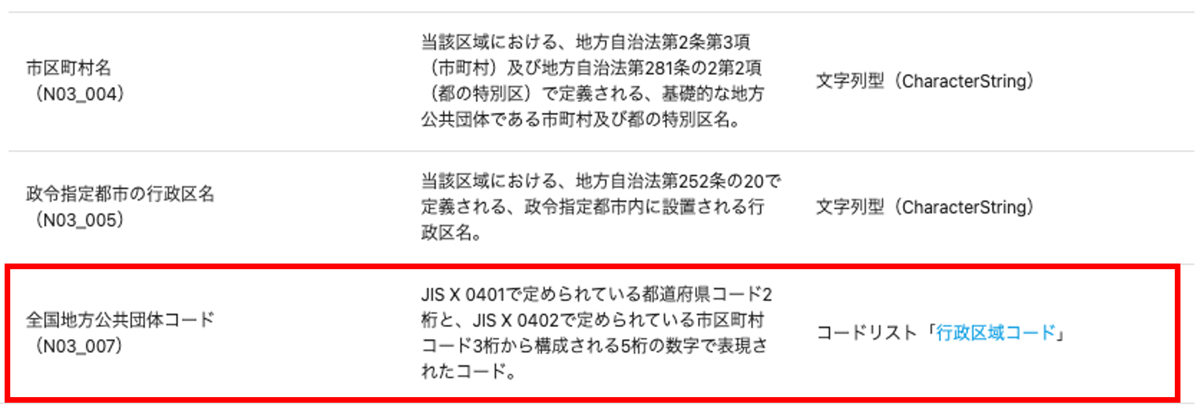 同様に、行政区域データについても抽出作業を行います。 行政区域データのダウンロードページを確認すると、「N03_007」という属性が行政区域コードであることがわかります。