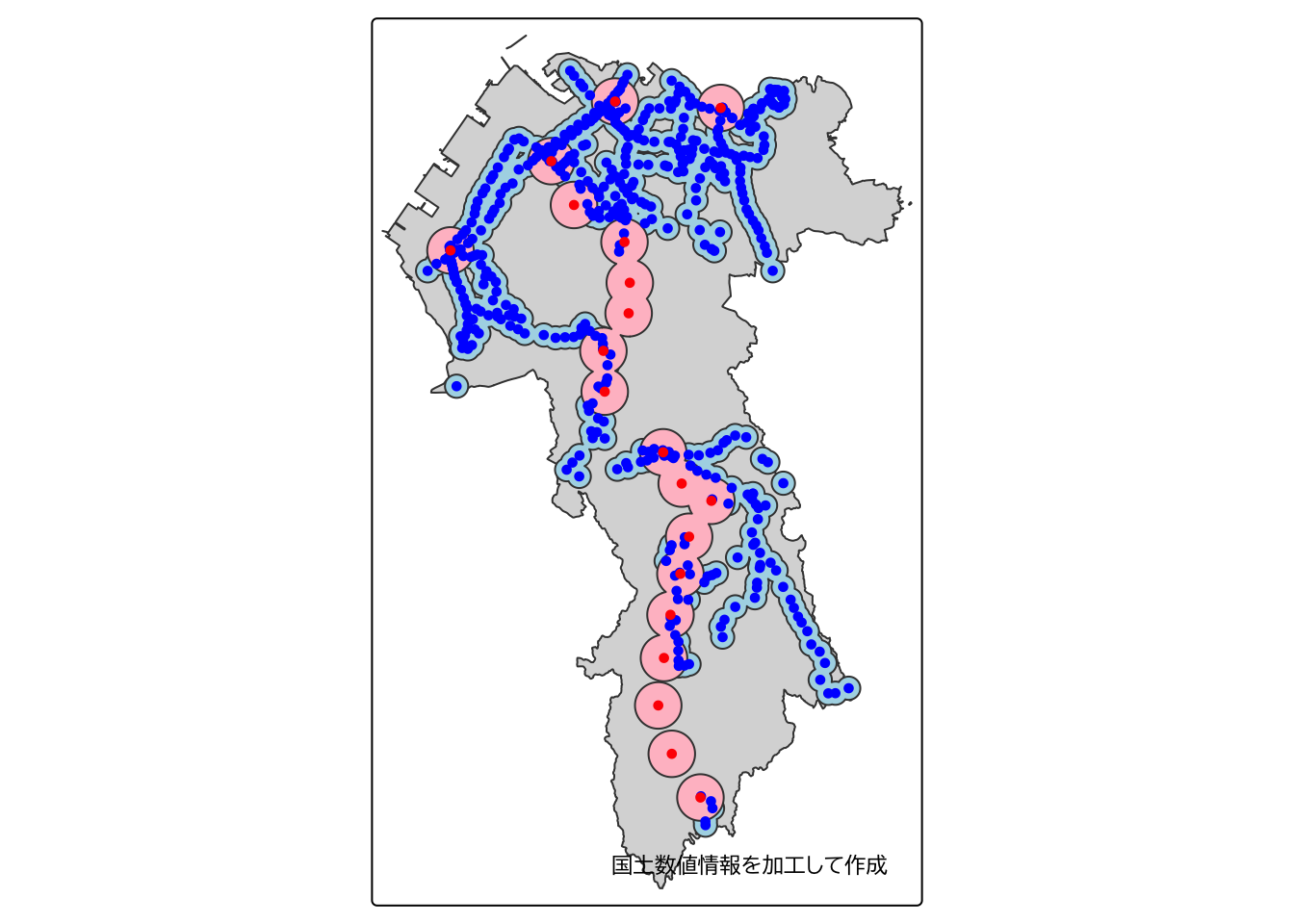 詳しい操作手順は「国土数値情報 地価公示データとRを活用した都市の地価分析」の記事で解説していますので、この記事では各駅をポイントデータとして抽出した結果のみをご紹介します。