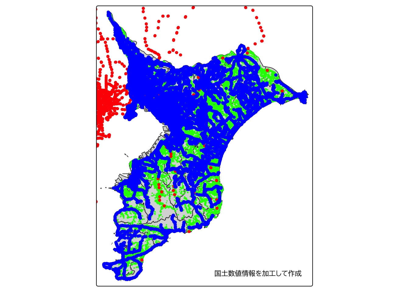 「250 mメッシュ人口データ」の読み込みに時間がかかったはずです。 これは、千葉県全体で44,082のメッシュが存在し、データ量が膨大なためです。 そのため、次のステップでは対象地域のデータに絞り込みます。