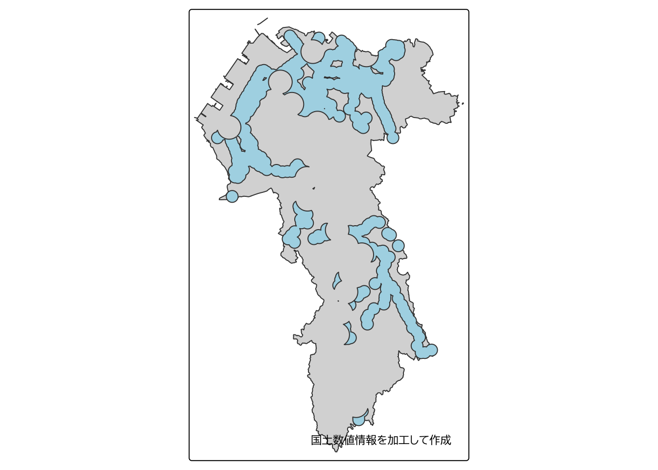 Rではsf::st_buffer関数でバッファを作成することができます。 また、sf::st_union関数を使って、重なり合うバッファ領域を1つの領域に統合しています。