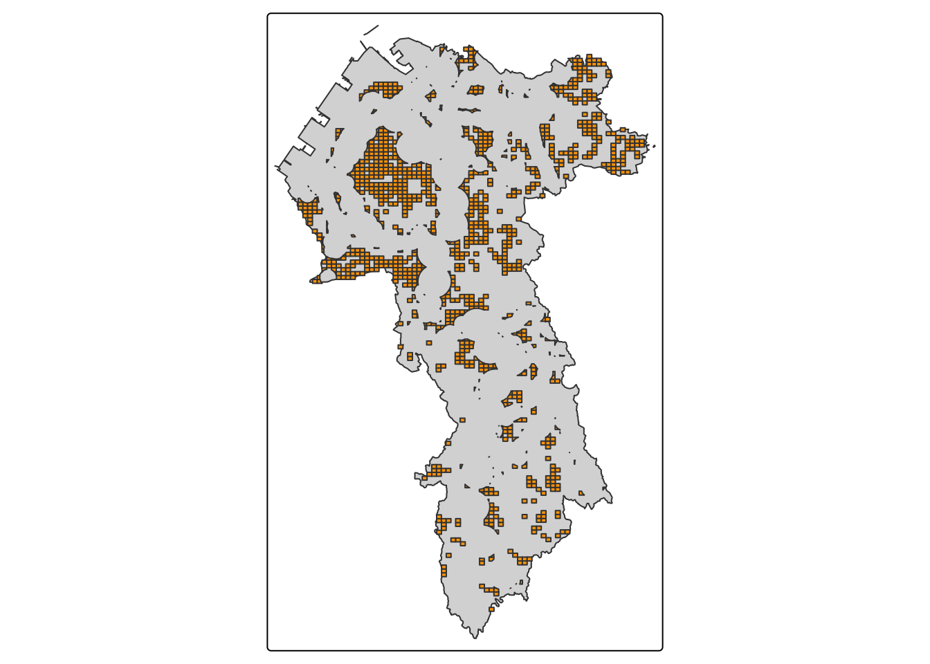 最後に、エリア間の比較を容易にするため、250 mメッシュ人口メッシュと、公共交通便利地域と公共交通不便地域それぞれとの「交差」を計算します。 Rでは、sf::st_intersection関数で、交差を計算することができます。