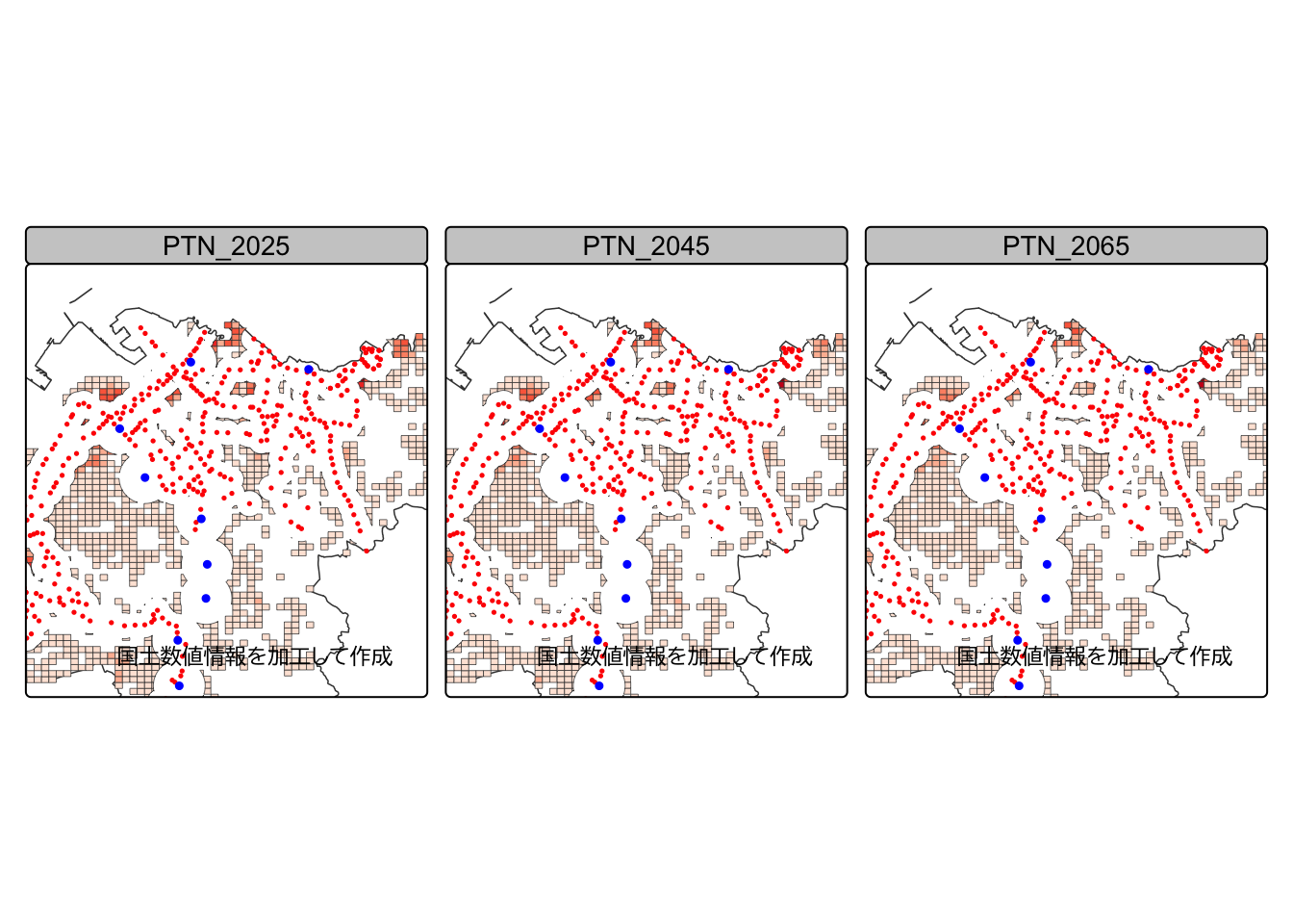 この計算を対象メッシュに対して行うことで、公共交通空白地域における将来推計人口を算出することができます。