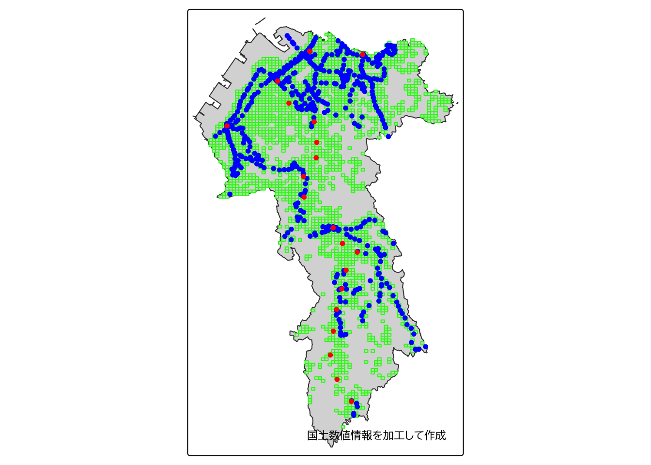 - 駅・バス停留所からの徒歩圏を基準としたエリアの作成