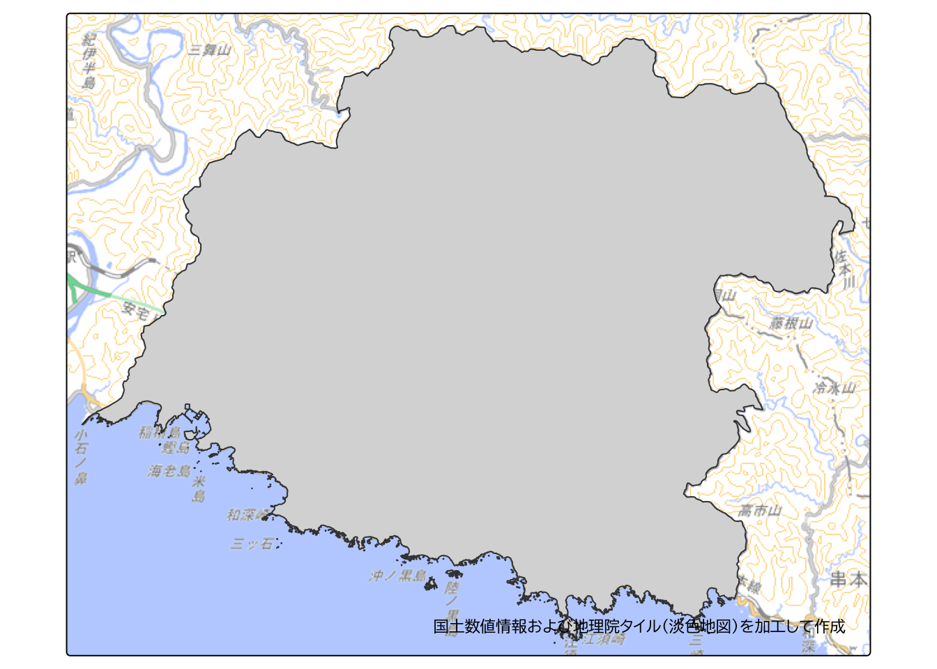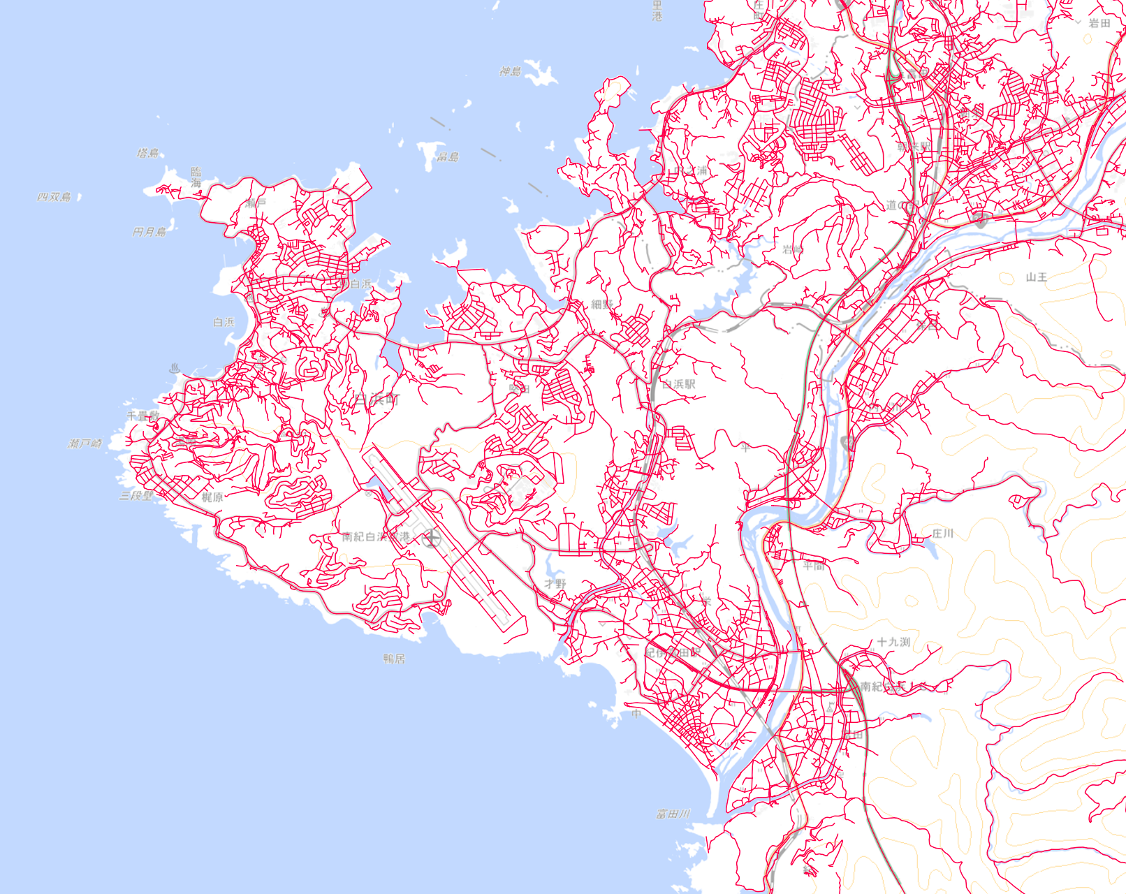 道路データは1次メッシュ単位で整備されており、比較的広い範囲をカバーしています。 今回は和歌山県すさみ町を対象に分析を行うため、すさみ町の行政区域データを使って道路データを切り出します。