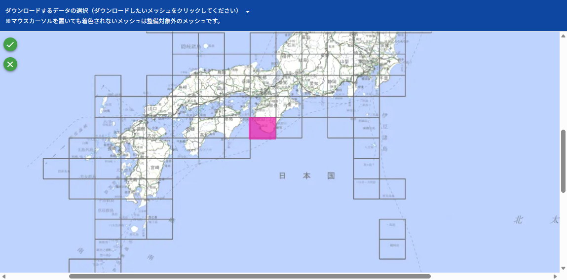 国土数値情報の「道路データのダウンロードページ」にアクセスします。 ページをスクロールすると、ダウンロード対象地域を選択できる地図が表示されます。 目的のエリアのメッシュを選択し、[ダウンロード]ボタンをクリックします。