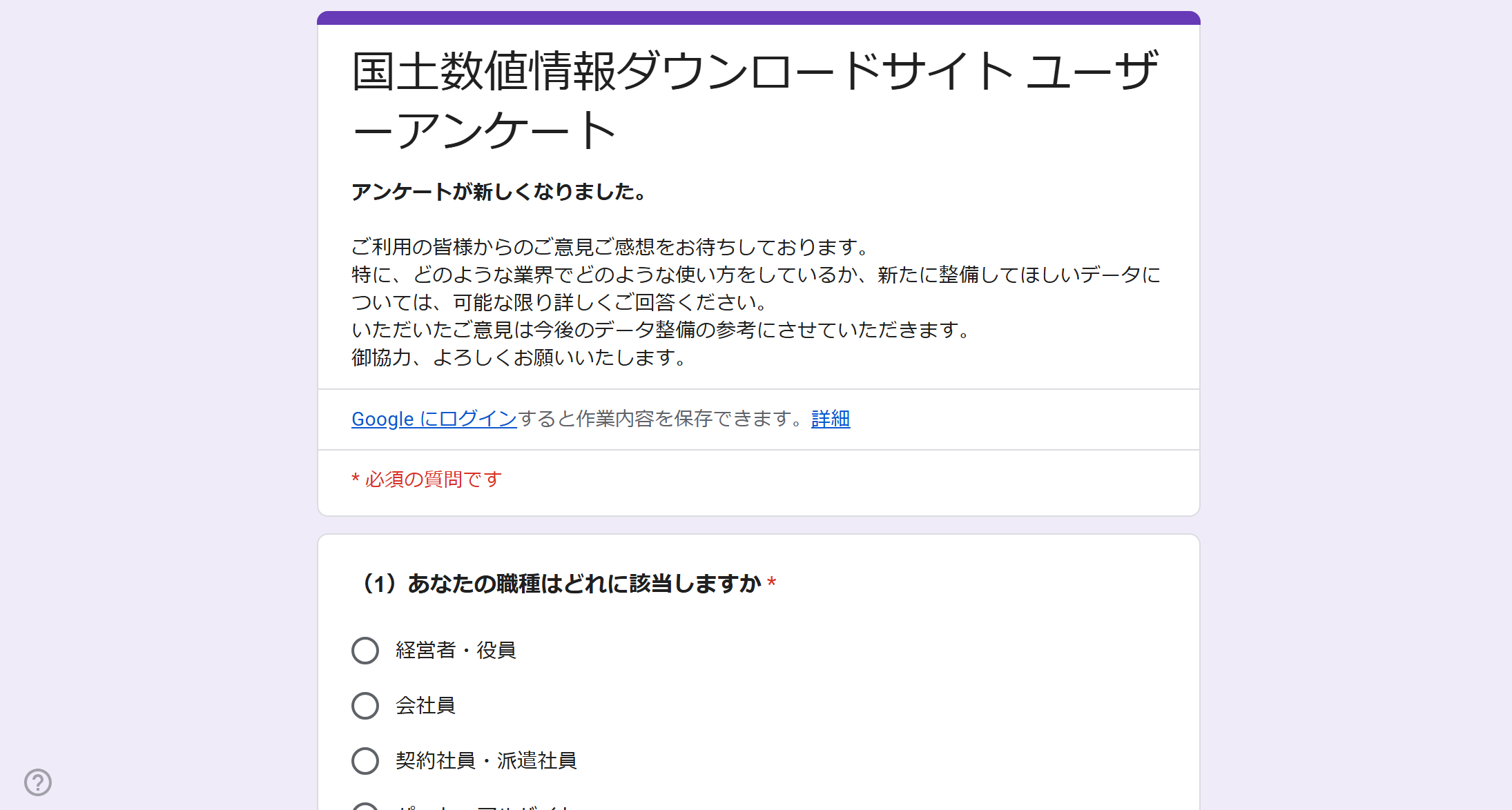 画面上に「国土数値情報ダウンロードサイト ユーザーアンケート」が表示されます。 必要に応じて回答し、回答を完了するか[スキップする]をクリックすると、データのダウンロードが開始されます。