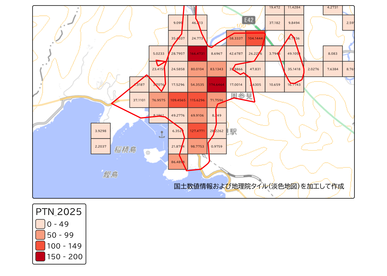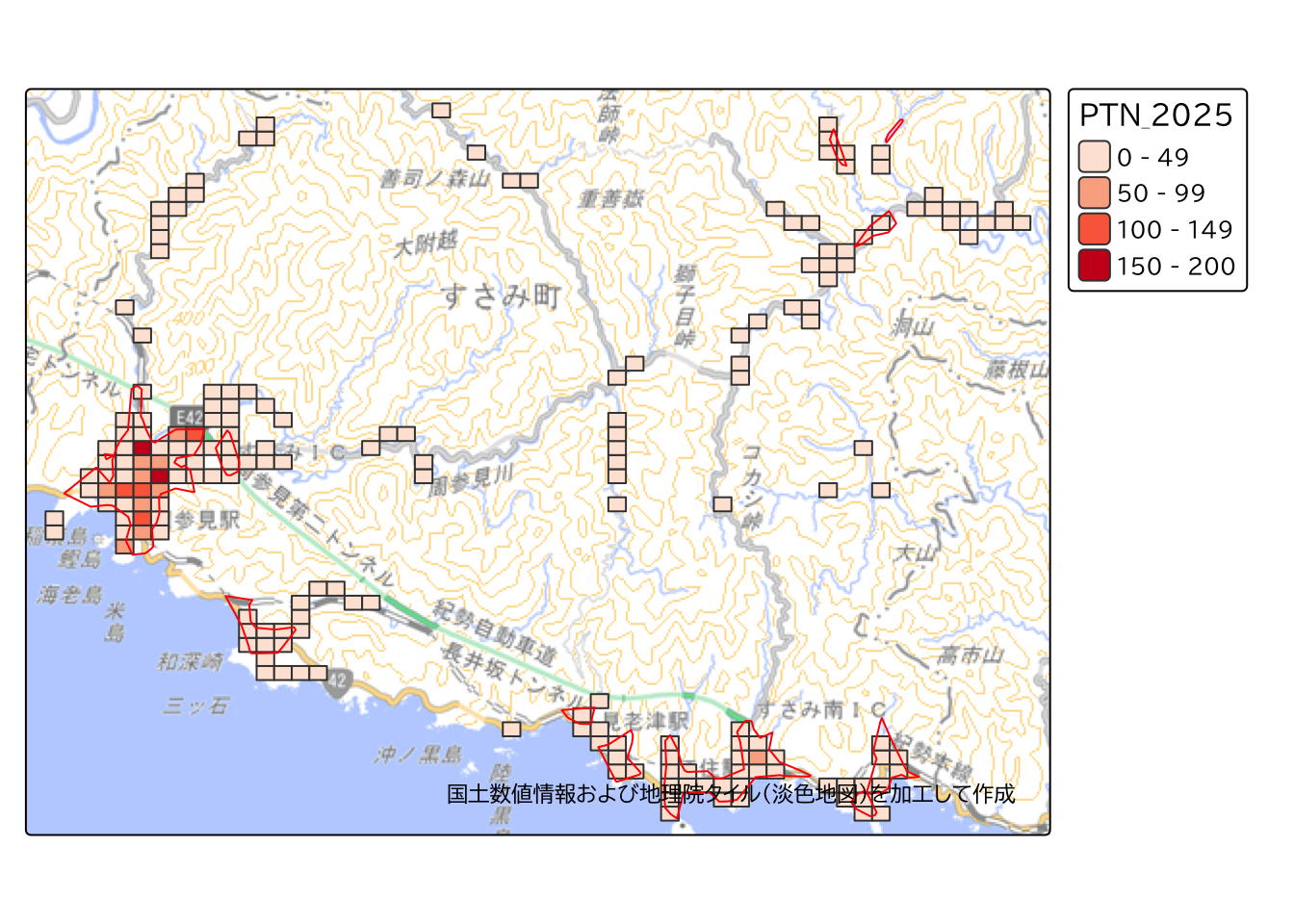 次に、詳細を確認するため、すさみ町役場周辺のエリアを見てみます。 メッシュのラベルには、「2025年の総数人口(PTN_2025)」の値を表示しています。