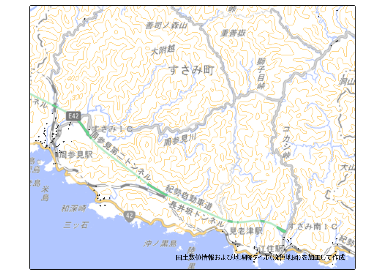 また、この記事では、和歌山県すさみ町を対象地域として分析を行います。 すさみ町では、南海トラフ地震を見据え、「フェーズフリー(平時と災害時の区別なく活用できる考え方)」をビジョンとしたスマートシティ構想を推進し、さまざまな実証実験が行われています (PLATEAUを活用したドローン航路作成とデジタル避難訓練(すさみ町役場地域未来課))。