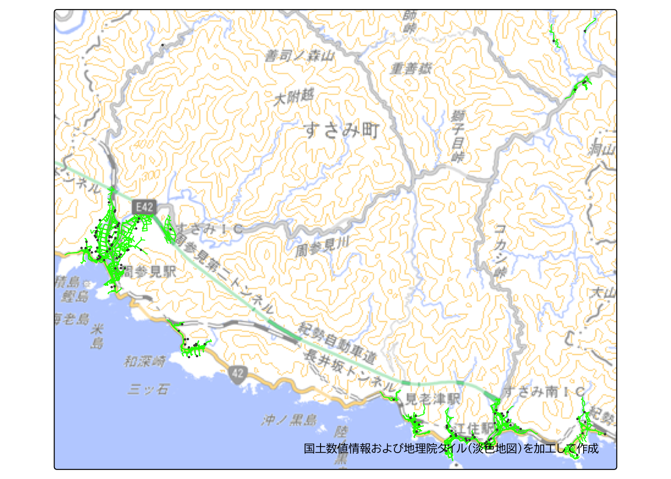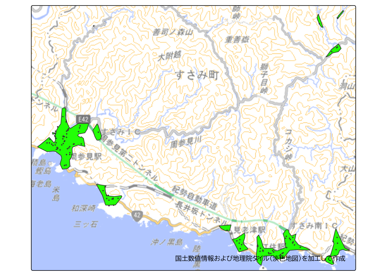 すさみ町全域を俯瞰すると、津波対応の指定緊急避難場所から500 m以内の到達圏について、山間部の一部メッシュは含まれていないものの、沿岸部においては大部分のメッシュが含まれていることが分かります。
