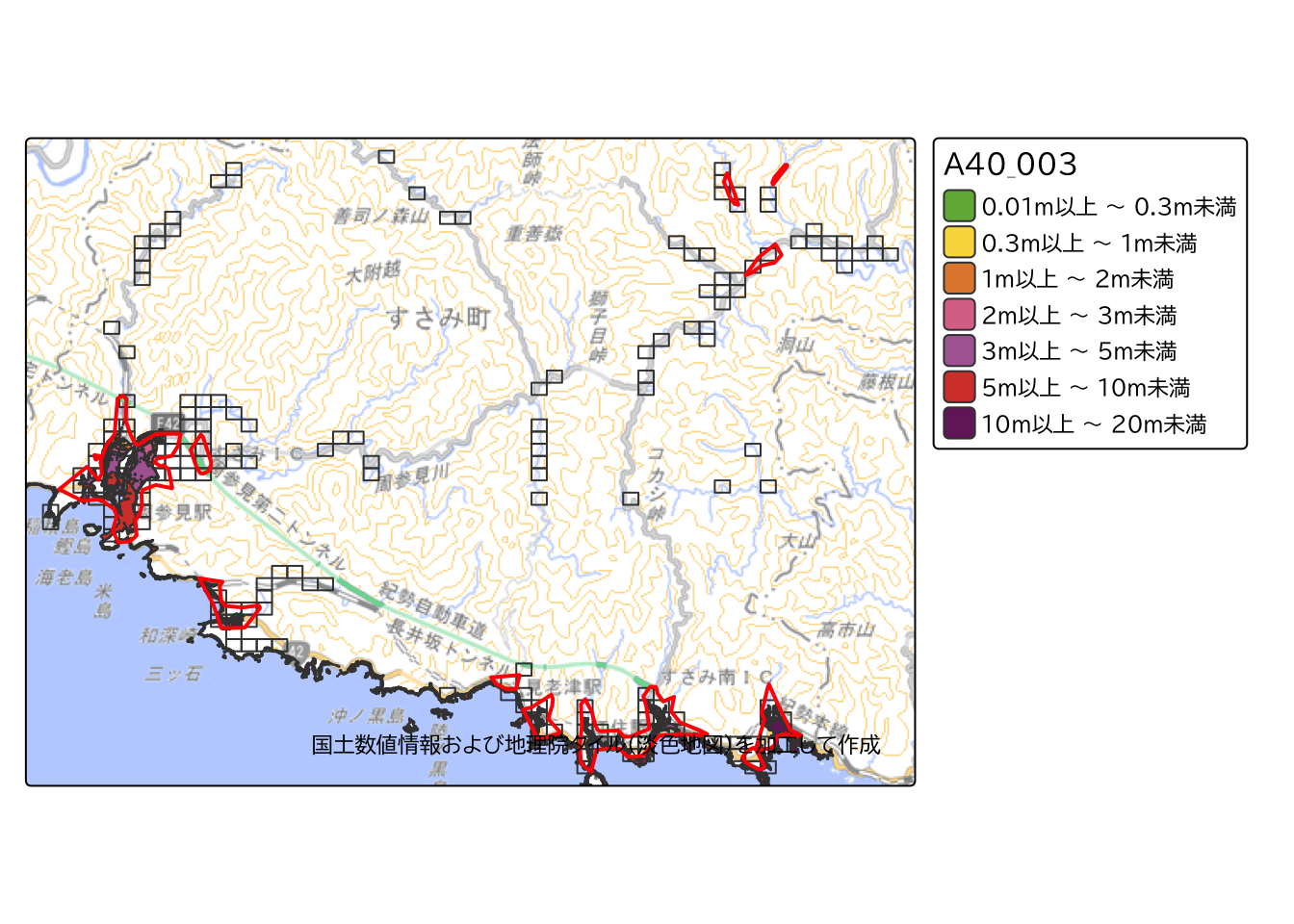 最後に、国土数値情報から「津波浸水想定データ」を重ねてみます。